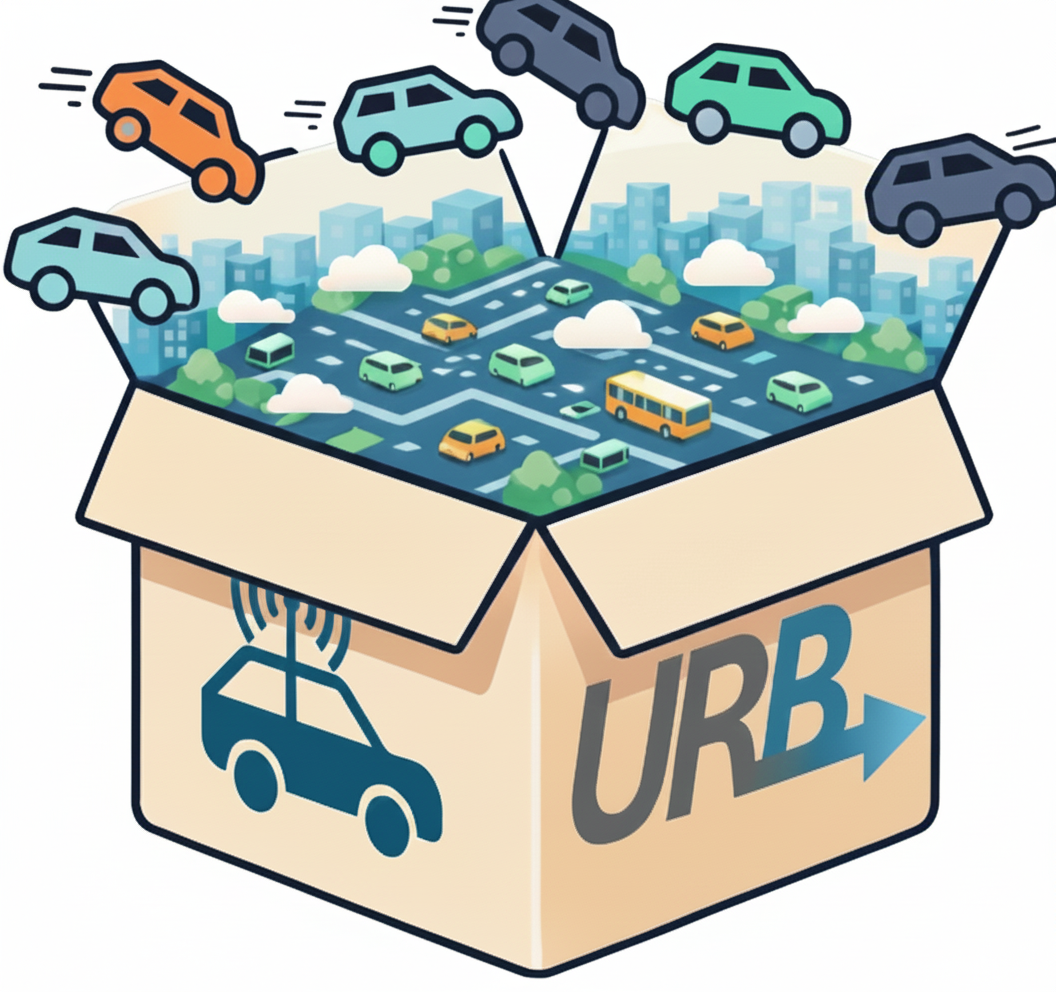OpenURB benchmarks mixed traffic where human-driven vehicles optimize individual travel time while AVs collaborate to minimize group travel time under dynamic population shifts. Leaderboards below compare algorithms across environment configurations, different tasks, and traffic networks using benchmark KPIs.